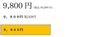 また税抜き表示であることを、消費者に誤解や勘違いをさせることなく明瞭に表示するための対策として、「税込価格表示の大きさ」「文字間余白や行間余白」「背景の色との対照性」にも配慮して値札等をつけなければなりません。