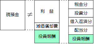 これら4つが役員報酬の額を考える場合の基本となります。その上でもうひとつ別の視点から見ていきましょう。右の図を見てください。利益とは収入から経費を差し引いたものですが利益と同じだけの現金預金が会社に残っているわけではありません。それは収入や経費が発生主義により計上されるため、実際に現金化されるまでには時間の差が生じるからです。また役員報酬は労働としての対価部分ではありませんので、役員報酬を支払う前の実際の儲けは(利益+減価償却費+役員報酬)となっていたはずです。この儲けの部分から「税金分」「投資分」「借入返済分」「配当分」を差し引いて残った部分が会社として無理なく役員報酬として支出できる額になります。これに前記の1から4の要素を考慮していただくと会社としてかなり適正な役員報酬の額が導き出されるはずですが、実際ここまで深く役員報酬の算定を行っている会社は少ないようです。